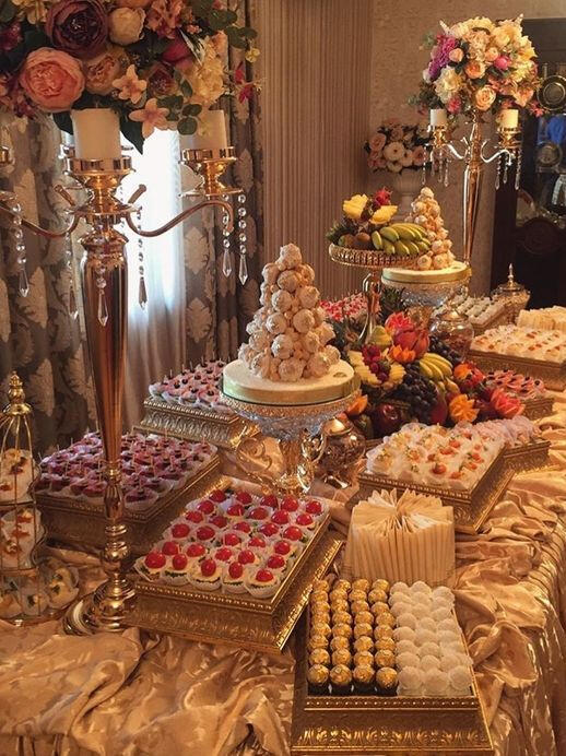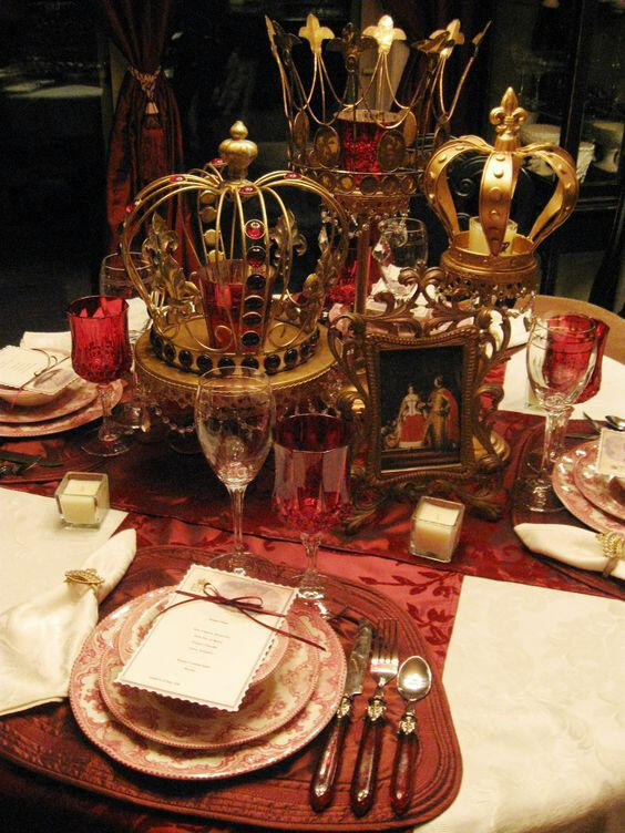 a large table spreads out in front of you. it is fully set with fine china and gold...